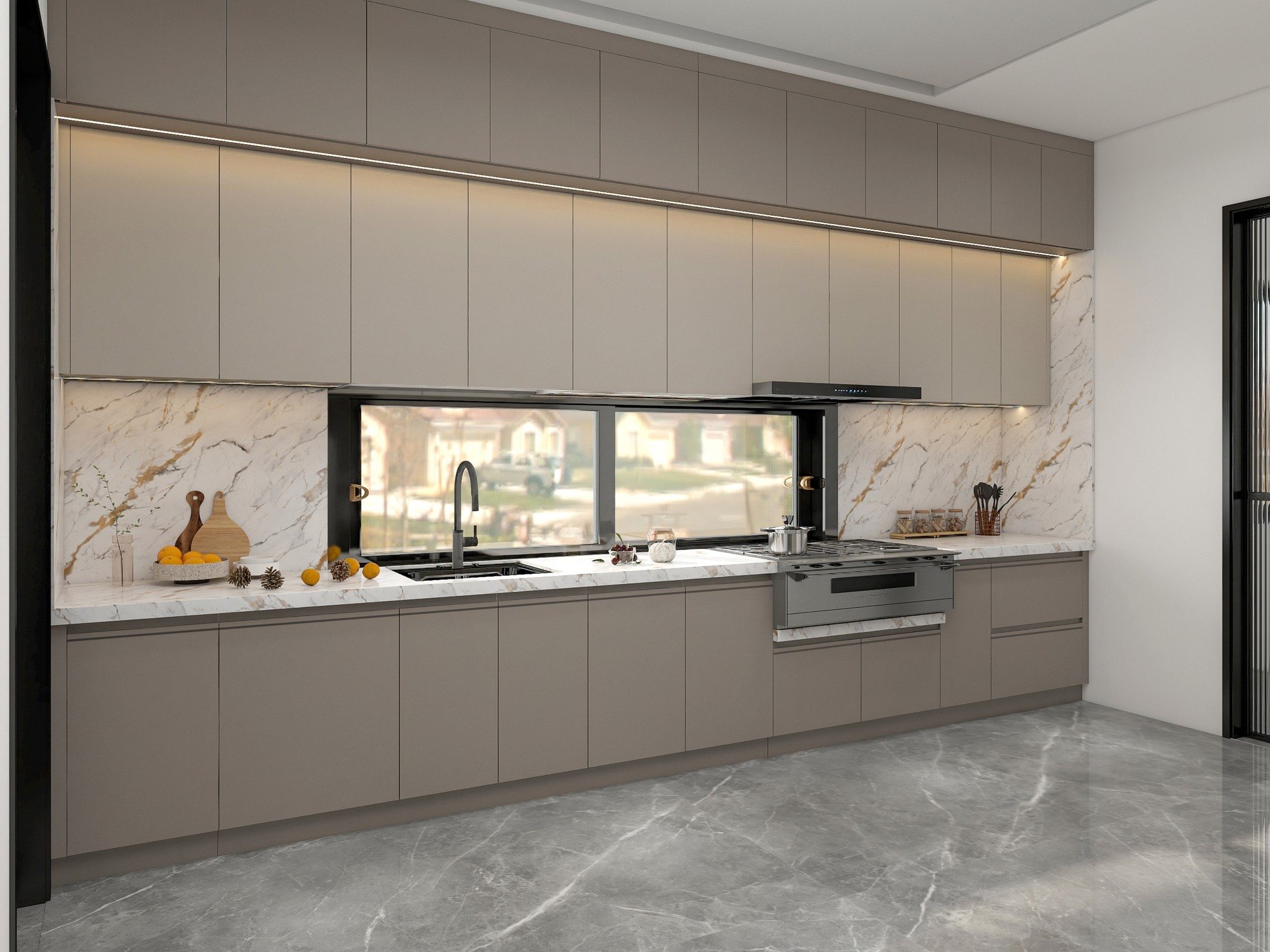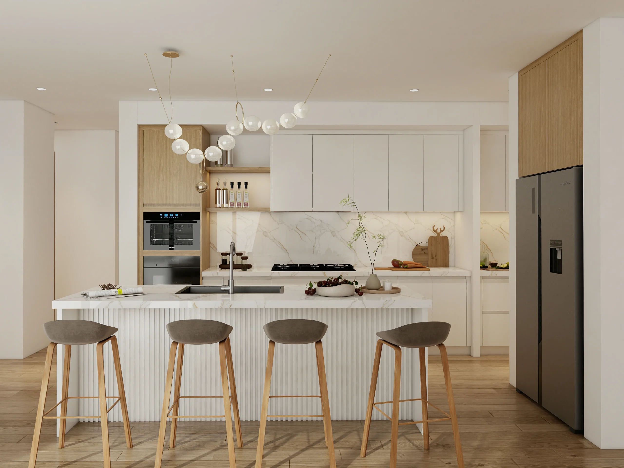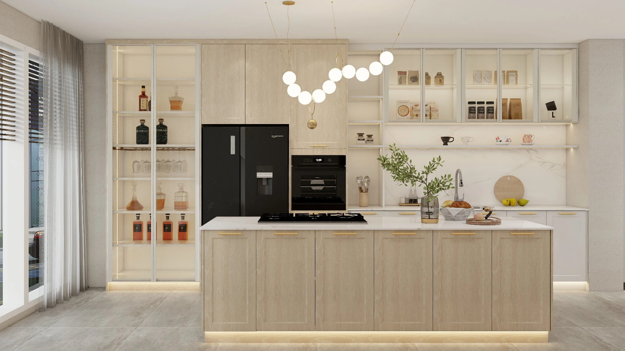 Sleek cabinetry with hidden storage keeps the kitchen organized and uncluttered. Marble countertops and a central island add practicality and luxury, while open shelving and display cabinets elevate the overall style.