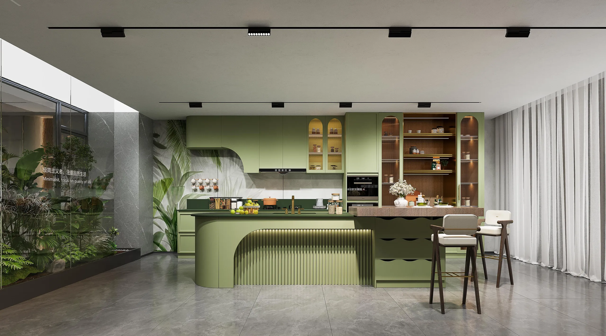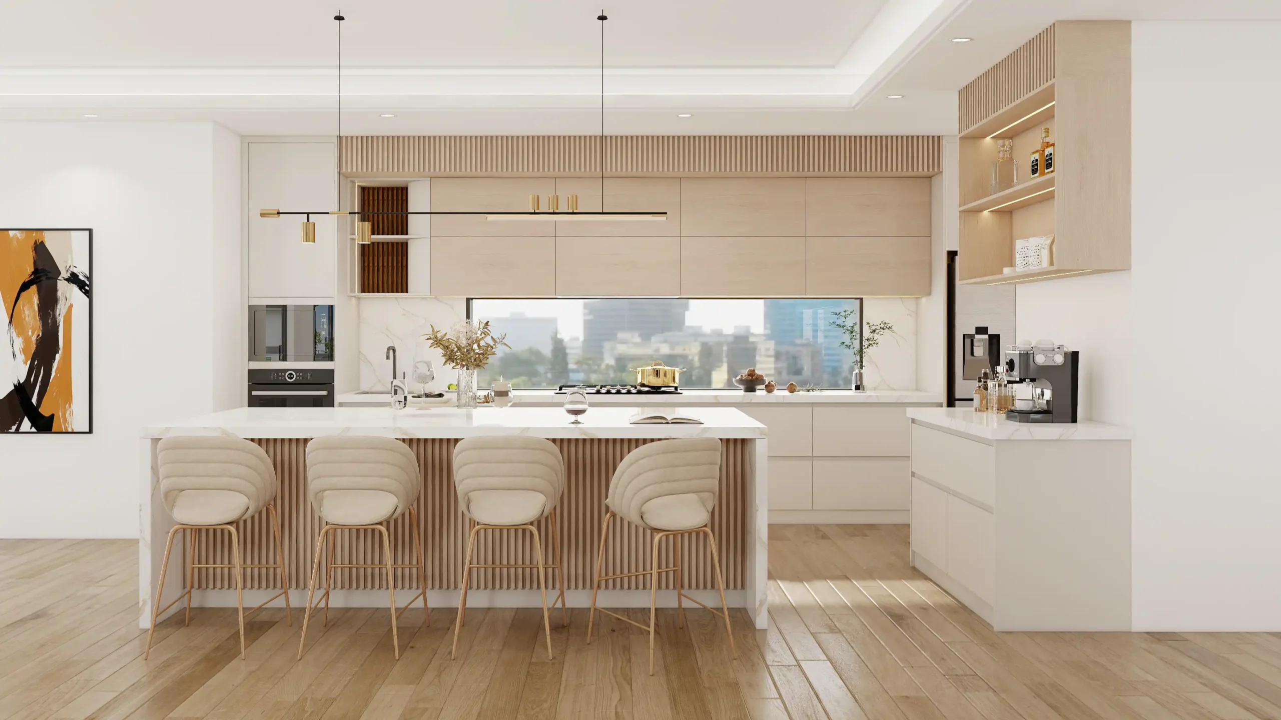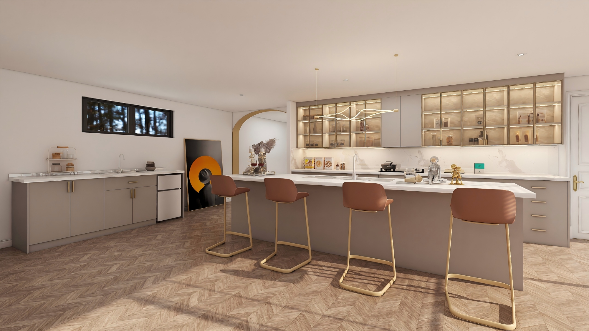 Sleek cabinetry with hidden storage keeps the kitchen organized and uncluttered. Marble countertops and a central island add practicality and luxury, while open shelving and display cabinets elevate the overall style.