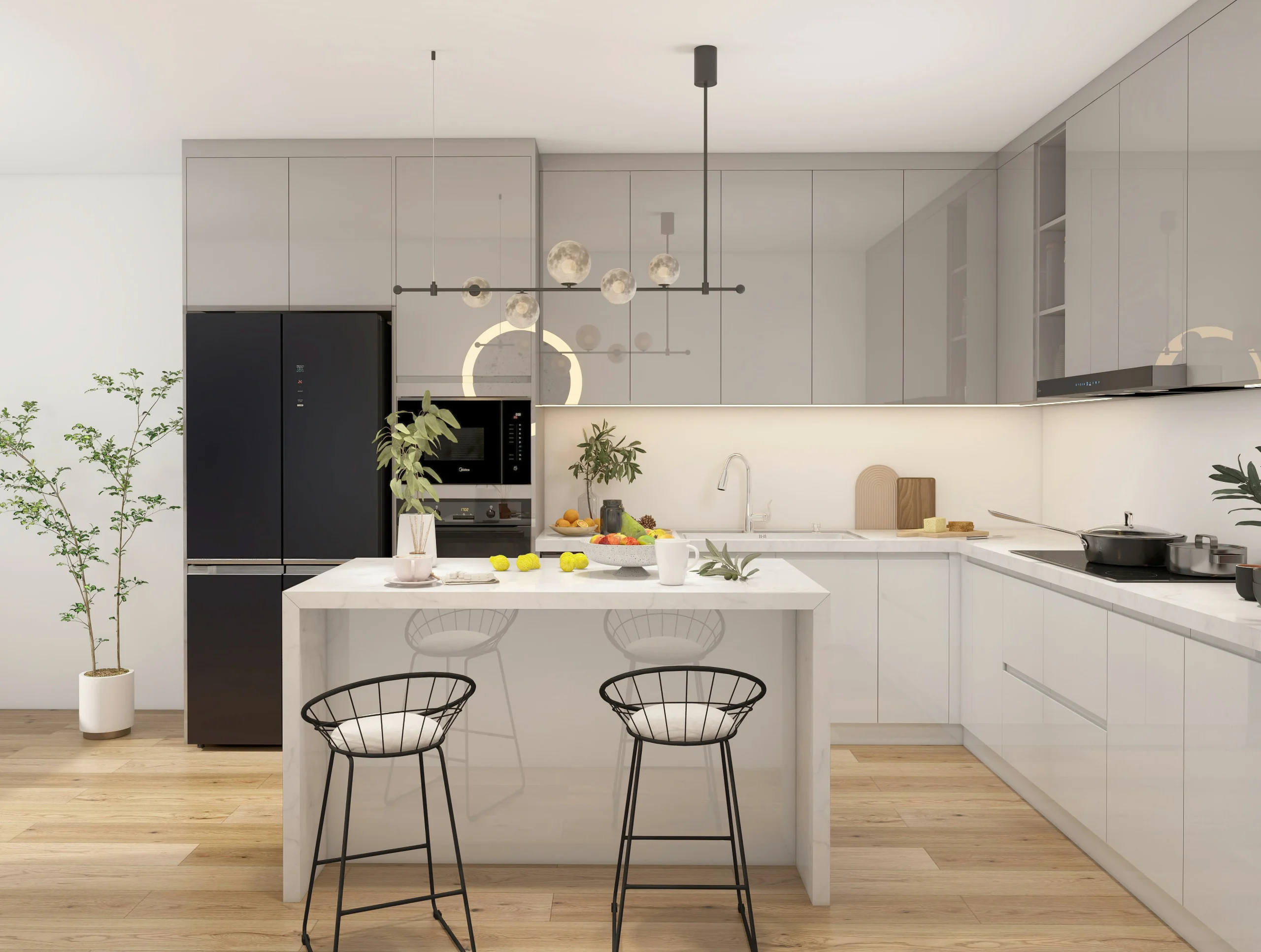 Bright and reflective, with shiny finishes in pure white to amplify light and openness.