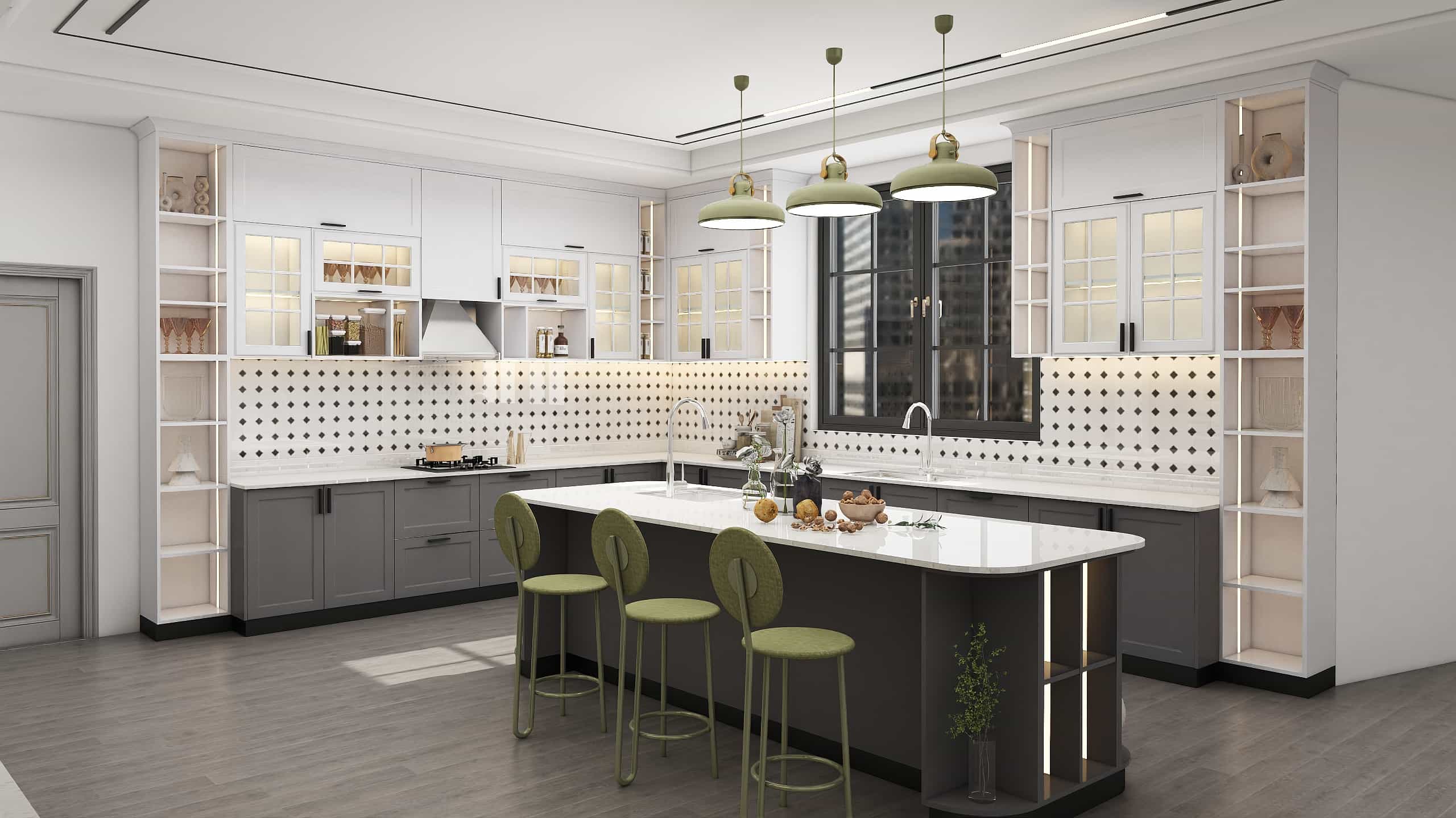 Product Design: Those with an affinity for timeless elegance are drawn to the allure of traditional and farmhouse designs. The blending of white and muted grey cabinetry captures a balance between classic charm and contemporary aesthetics. The refined lacquer finish, complemented by the particle board base, adds depth and sophistication to the space, paying homage to age-old craftsmanship yet echoing the comforts of modern-day living.