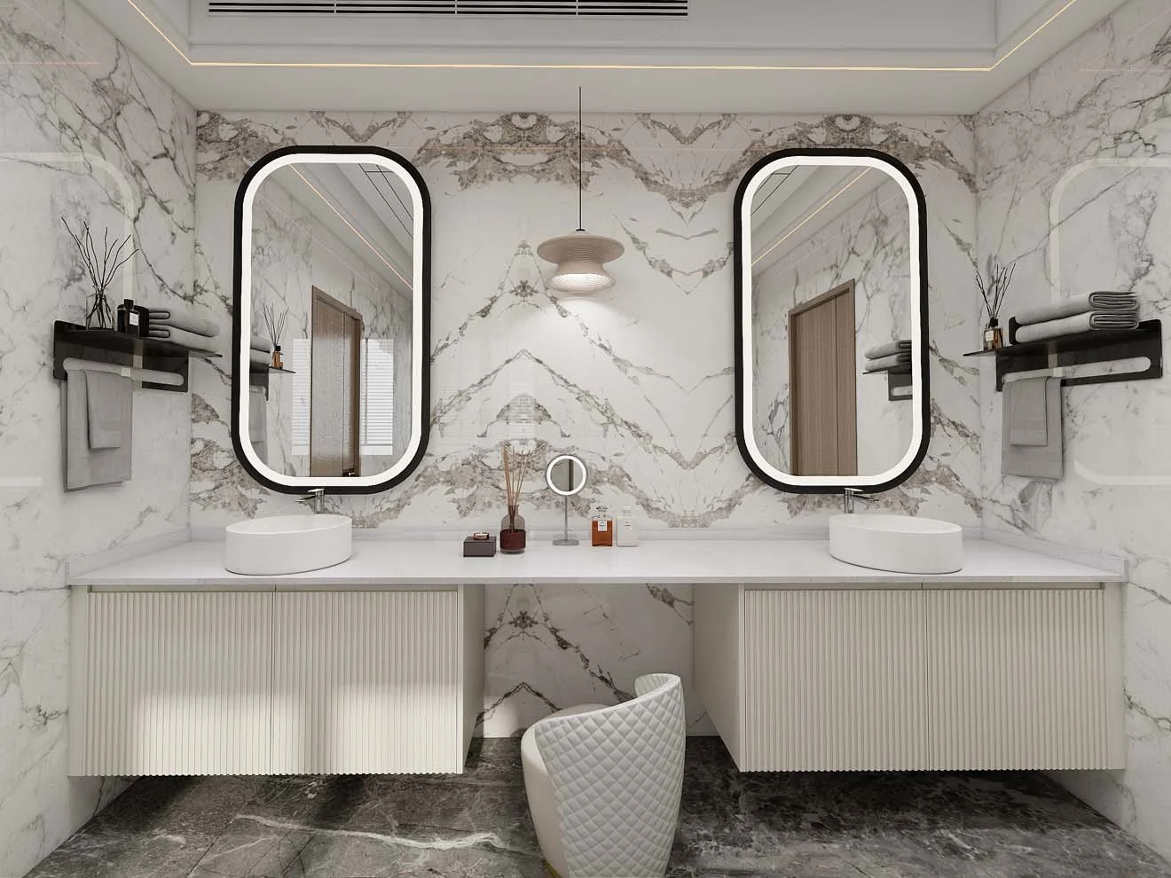 Constructed from high-quality materials, these cabinets are designed to withstand the humid environment of a bathroom. The craftsmanship is evident in the precise alignment of the cabinets with the marble walls and the seamless integration of the sinks and fixtures. The choice of materials and the attention to detail in the construction reflect a commitment to quality that is necessary for luxury bathroom fittings.