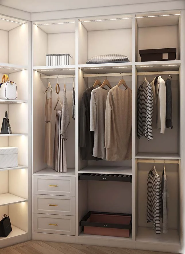 This closet features a crisp white finish that not only brightens the space but also lends a sense of calm and cleanliness. The surfaces are treated to be durable and easy to maintain, resisting stains and scratches, which is essential for preserving the closet’s pristine appearance.