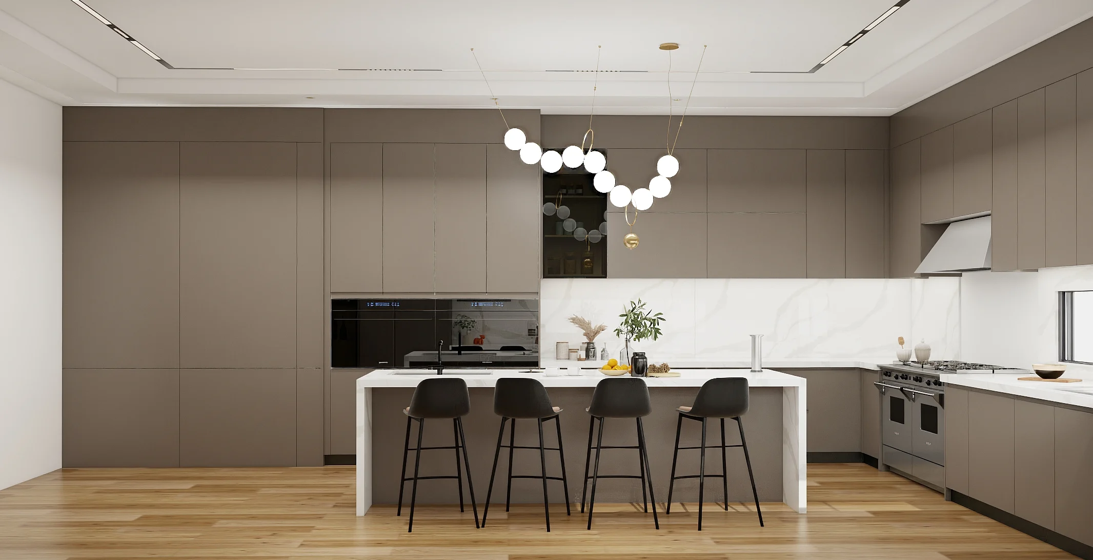 The neutral, earthy tones of the cabinetry bring warmth and sophistication, perfectly complementing contemporary interiors. The matte finish enhances durability, resisting fingerprints and scratches. The surfaces are smooth and easy to maintain, offering a low-maintenance solution while staying trendy.