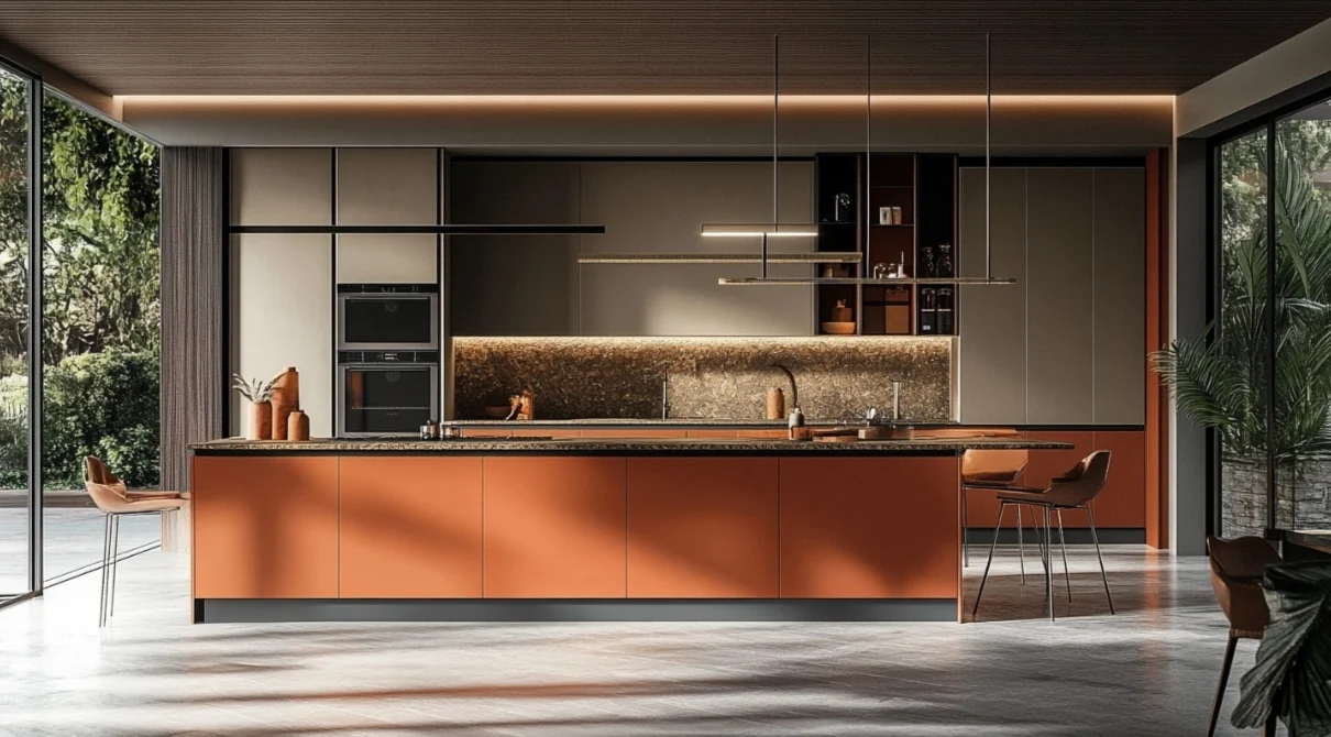 modern Orange kitchen cabients, Integrate neutral colors (like beige, taupe, or soft gray) into walls or decorative elements