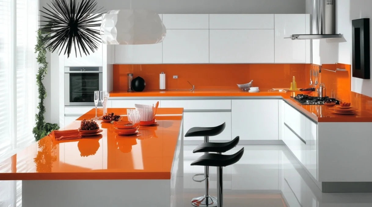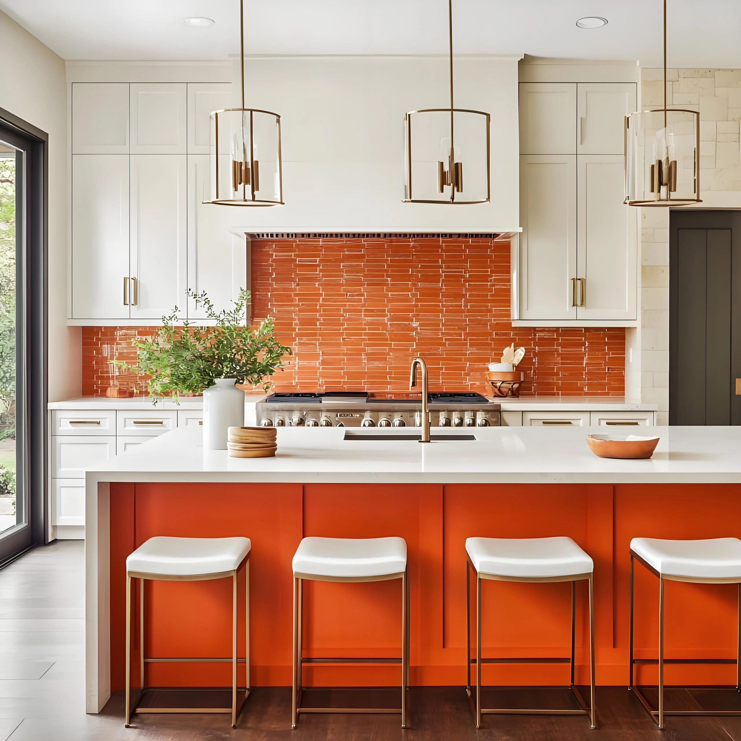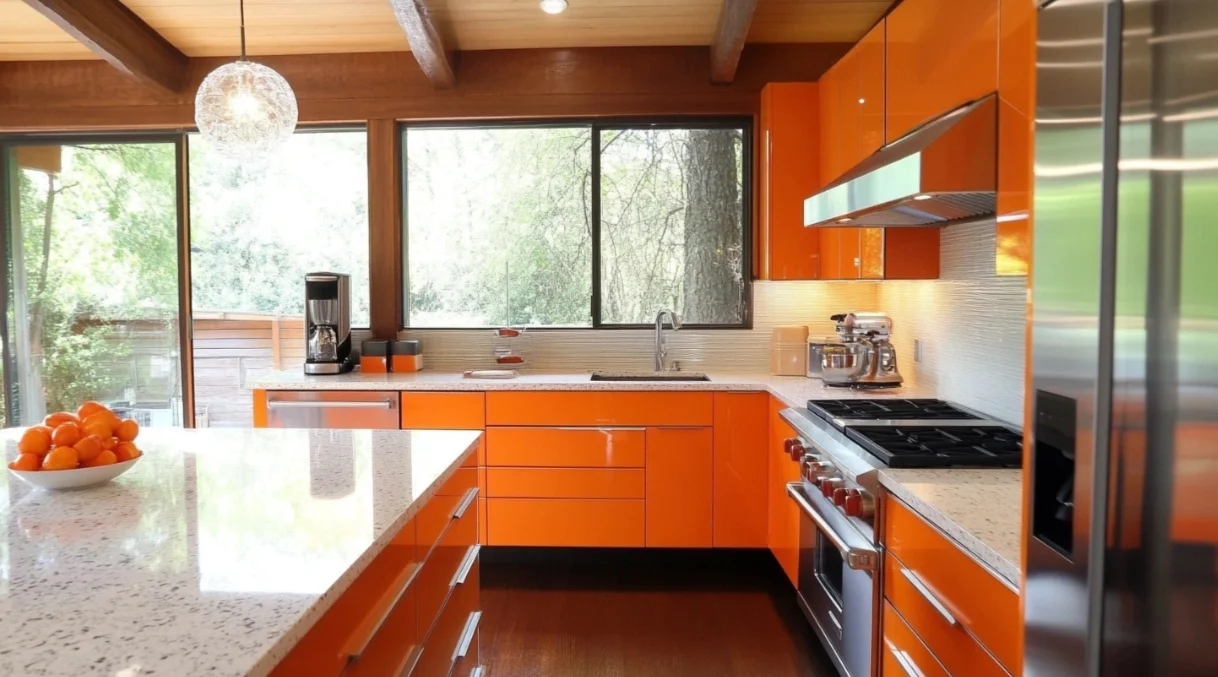Orange adds a retro flair to mid-century modern kitchens, beautifully complementing wood accents and geometric patterns.