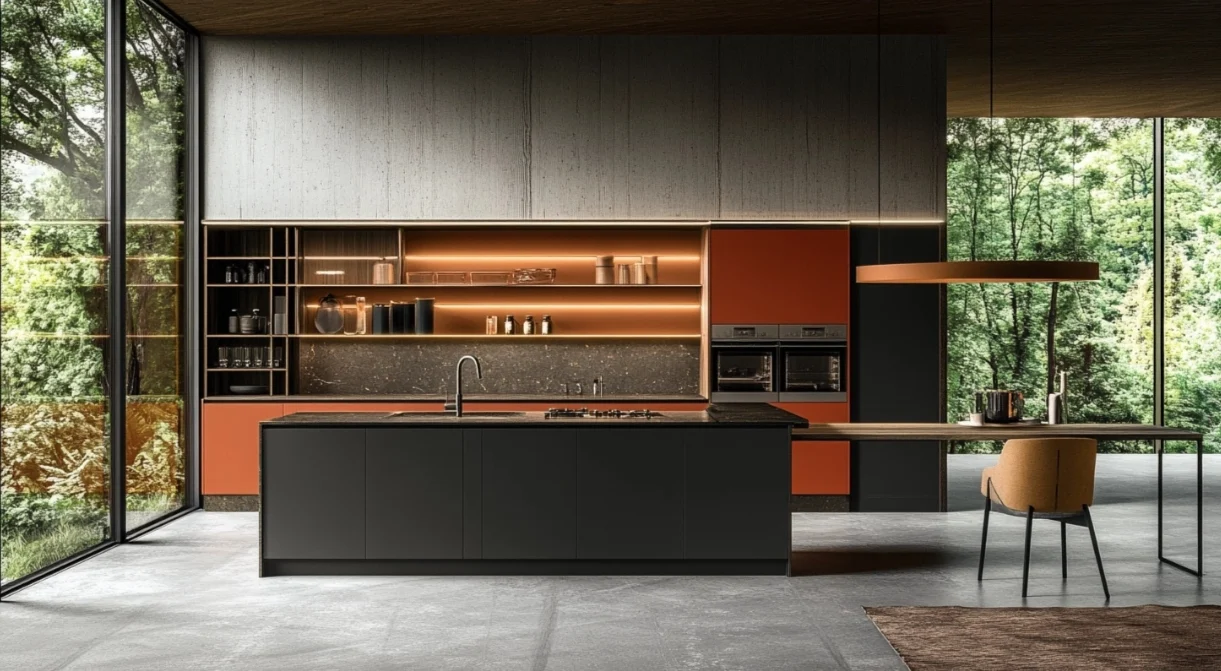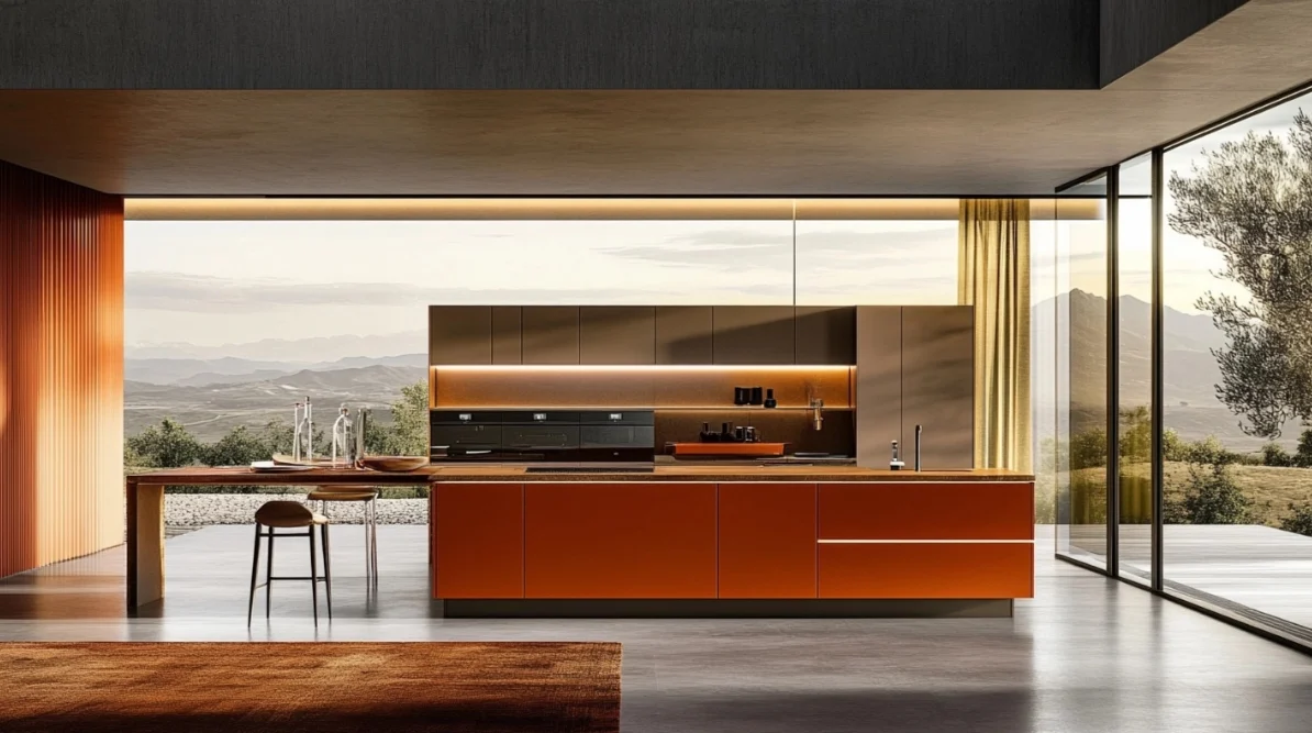 In a modern kitchen, orange cabinets bring a bold, sleek vibe.